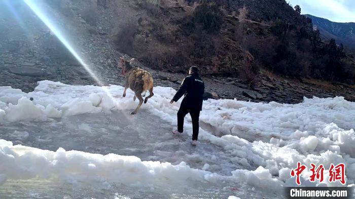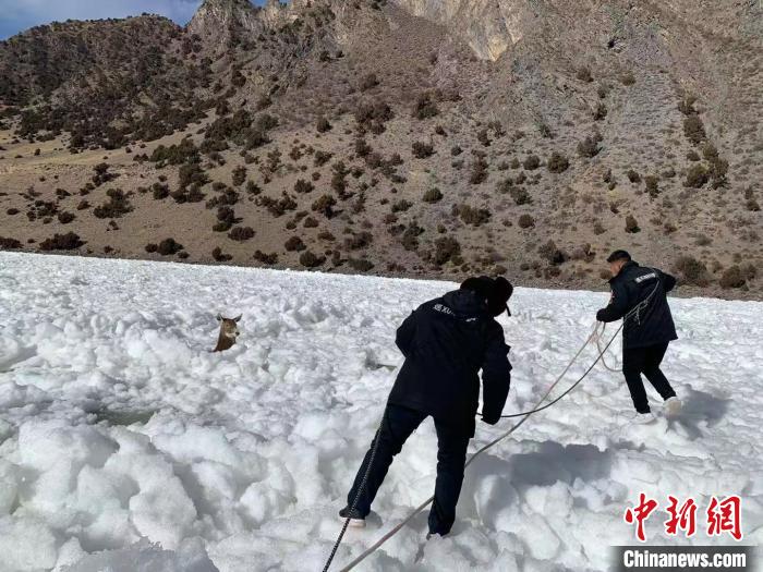 青海生態(tài)保護(hù)人員營(yíng)救被困長(zhǎng)江源冰面一級(jí)保護(hù)動(dòng)物白唇鹿