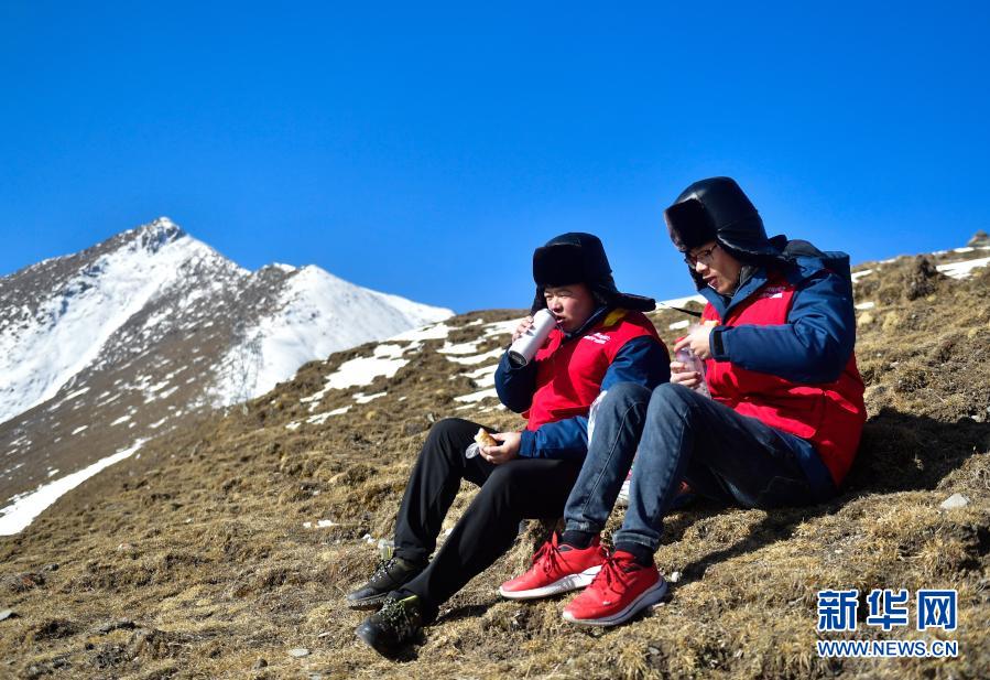 1月21日,國(guó)家電網(wǎng)西寧供電公司輸電運(yùn)檢中心運(yùn)檢人員在巡檢途中吃午飯。新華社記者 張龍 攝