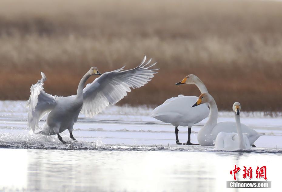 連日來,成群的野生大天鵝陸續(xù)飛臨四川省阿壩藏族羌族自治州若爾蓋縣高原小鎮(zhèn)麥溪鄉(xiāng)的洛賈瓊果河棲息越冬。這些跨越千里來此越冬的精靈讓洛賈瓊果河充滿了童話色彩,近百只天鵝在偌大的湖面上自由自在地覓食嬉戲,一會兒在天空翱翔,一會兒又成群結隊地在湖面上追逐,時而淺吟低唱,時而引吭高歌,時而振翅高飛,愜意十足,為冰封雪凍的高原濕地增添了些許靈動與生機,成為草原冰雪世界一道靚麗的風景。