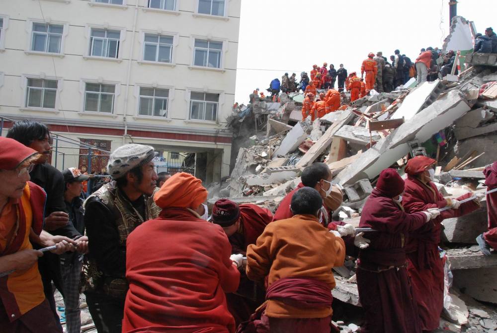 圖為2010年4月16日,救援隊(duì)員在結(jié)古鎮(zhèn)民族賓館廢墟上進(jìn)行搜救。