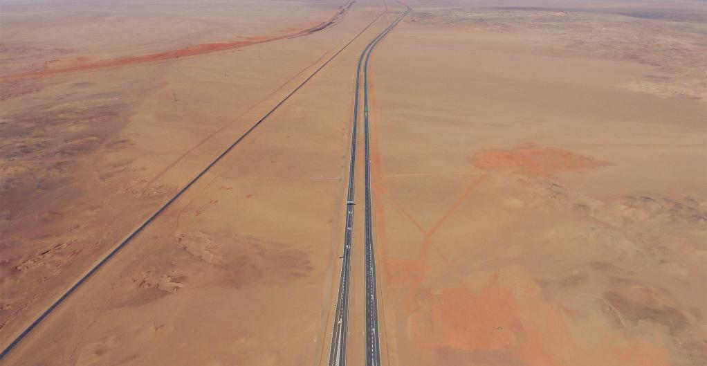 俯瞰穿越戈壁的京新高速公路額濟(jì)納旗段。新華社記者 鄧華 攝