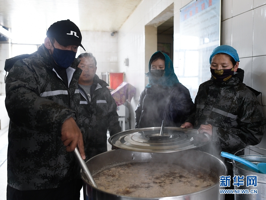 5月22日,在瑪多縣黃河鄉(xiāng)寄宿制學(xué)校救災(zāi)安置點(diǎn),老師們在給學(xué)生制作肉粥。新華社記者 張龍 攝