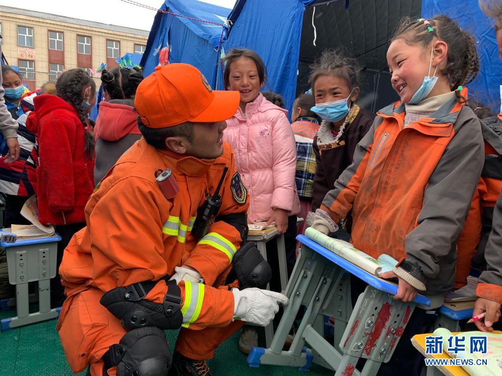 5月25日,青海省玉樹藏族自治州消防救援支隊(duì)消防員群英尕?。ㄗ螅┰诂敹嗫h民族寄宿制中學(xué)的安置區(qū)與學(xué)生交談。 新華社記者 解統(tǒng)強(qiáng) 攝