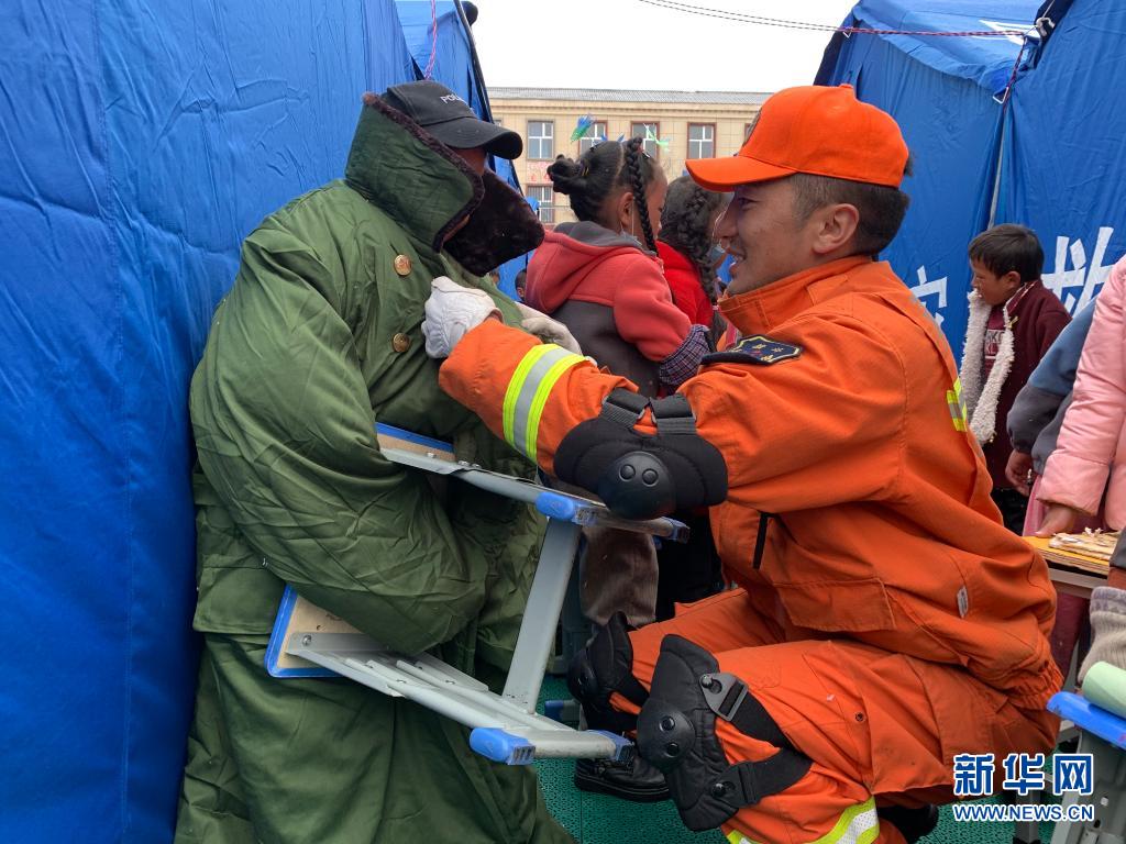 22日,地震發(fā)生后,群英尕丁來到安置區(qū)搭建帳篷和消防排查,12歲的班瑪華桑就與身穿橙色制服的群英尕丁結(jié)下了兄弟情誼?!拔覀兪且惠呑拥男值?,這幾天你也要照顧好自己。”群英尕丁笑著囑咐班瑪華桑。