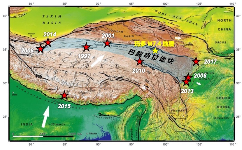 巴顏喀拉地塊地理位置及其周緣7級以上大地震分布。青海省科技廳供圖