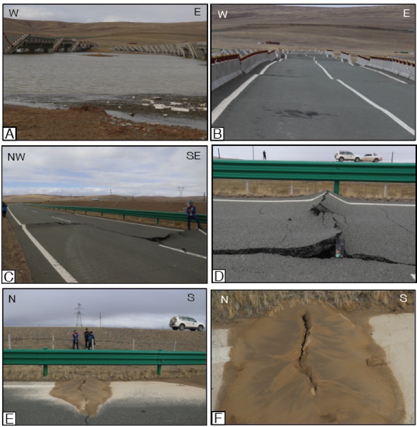 應(yīng)急考察隊還發(fā)現(xiàn),G214野馬灘大橋附近地表破裂極為明顯,破裂帶寬度5至8米不等,出現(xiàn)大量砂土液化現(xiàn)象,部分砂土液化點(diǎn)仍在冒水。G214野馬灘大橋受本次地震破壞嚴(yán)重,橋體坍塌,呈多米諾式,橋面一致向南。大橋南端公路路面造成路面擠壓突起,雙向車道擠壓突起不一致,最高突起達(dá)20厘米。