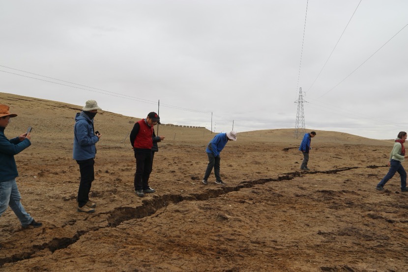 應(yīng)急考察隊相關(guān)負(fù)責(zé)人介紹,考察隊在白瑪納村附近發(fā)現(xiàn)地震次生破裂多處,黃河鄉(xiāng)附近向北西二十多公里地表破壞較為嚴(yán)重,破裂帶整體走向近120度,沿線隨處可見張裂隙、砂土液化等現(xiàn)象,路旁電線桿傾斜嚴(yán)重。接近G214國道一處地表破裂切過公路形成最大左行位錯量。根據(jù)野外現(xiàn)象觀察,斷裂具有左行走滑兼正斷的運(yùn)動學(xué)特性。