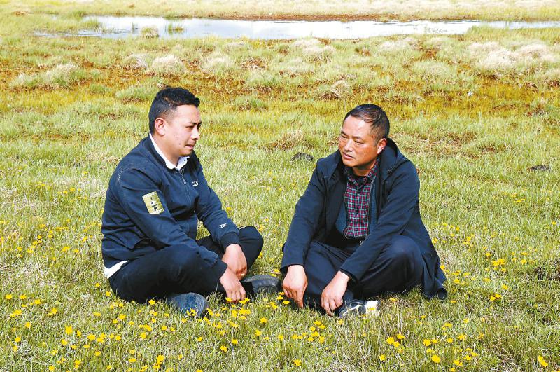 若爾蓋縣科學(xué)技術(shù)和農(nóng)業(yè)畜牧局局長張建榮(右)與牧民交流。四川日報全媒體記者 徐登林 攝