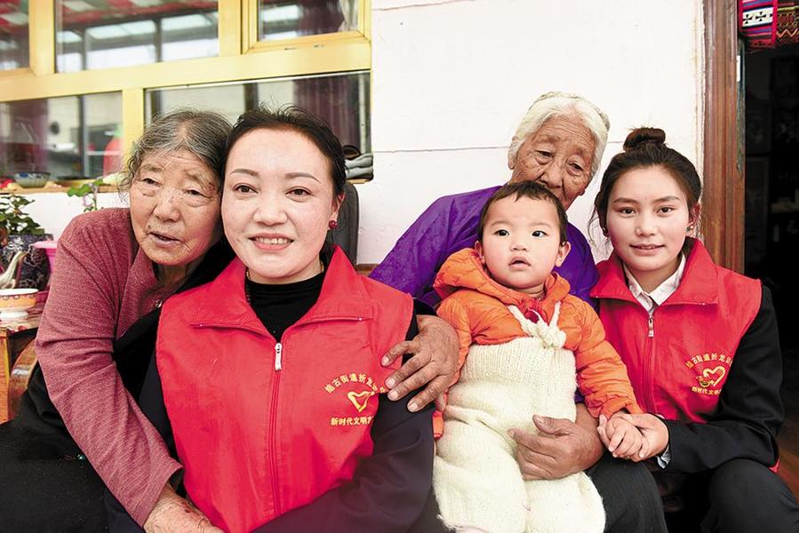 白瑪拉毛和社區(qū)孤寡老人在一起。