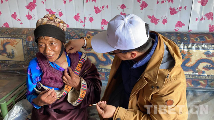49歲的拉毛羊措則是甲狀腺手術(shù)康復(fù)不久,她愛人已經(jīng)去世,和一兒一女及小外孫女一起生活,而女兒也患有肺結(jié)核??吹剿蛠淼乃幬锱c生活用品,拉毛羊措一直用藏語說著“謝謝”,并豎起大拇指,臉上始終帶著發(fā)自內(nèi)心的淳樸笑容。