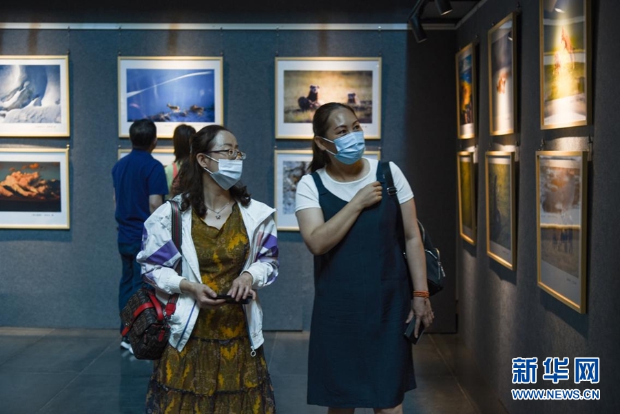 展覽現(xiàn)場,觀眾正在觀賞影像祁連山系列作品。新華網(wǎng) 齊雨萌 攝