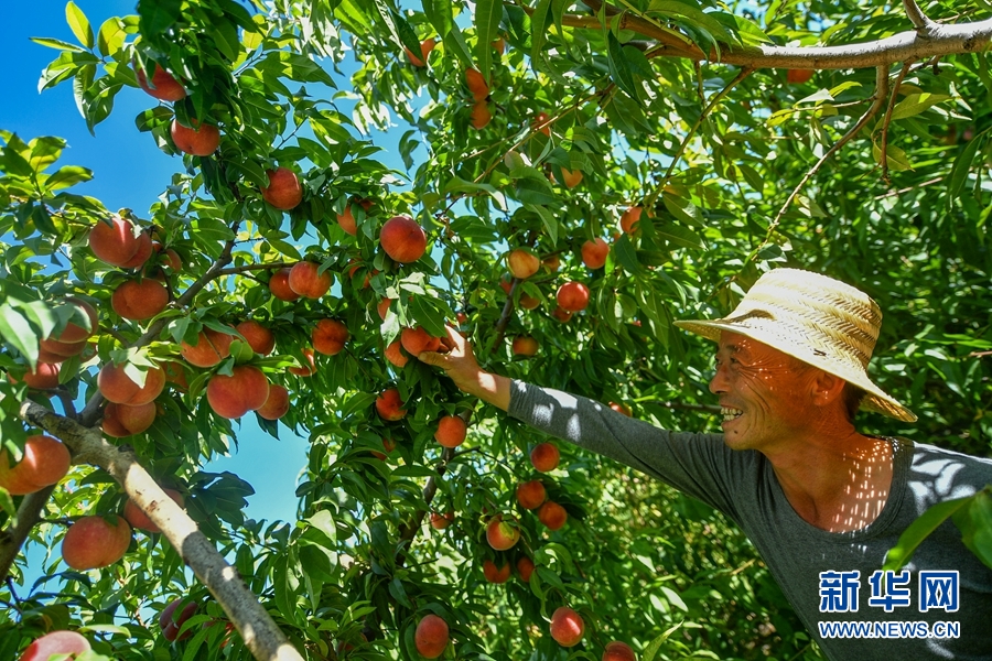 朱聯(lián)產在果園內采摘桃子。新華網 潘彬彬 攝