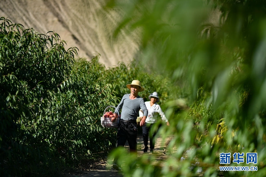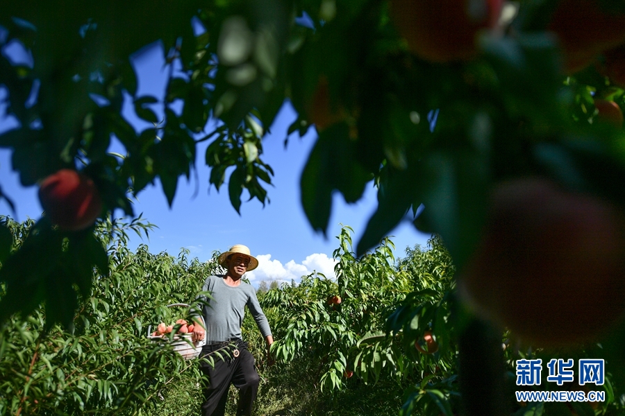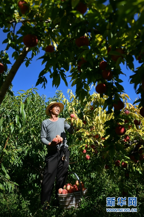 9月23日,青海省海南藏族自治州貴德縣河西鄉(xiāng)果農朱聯(lián)產在果園內采摘桃子。新華網 潘彬彬 攝