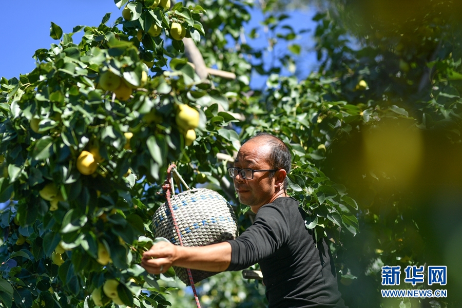 9月23日,貴德縣河東鄉(xiāng)下羅家村村民楊林春在自家的農家院采摘長把梨。新華網 潘彬彬 攝
