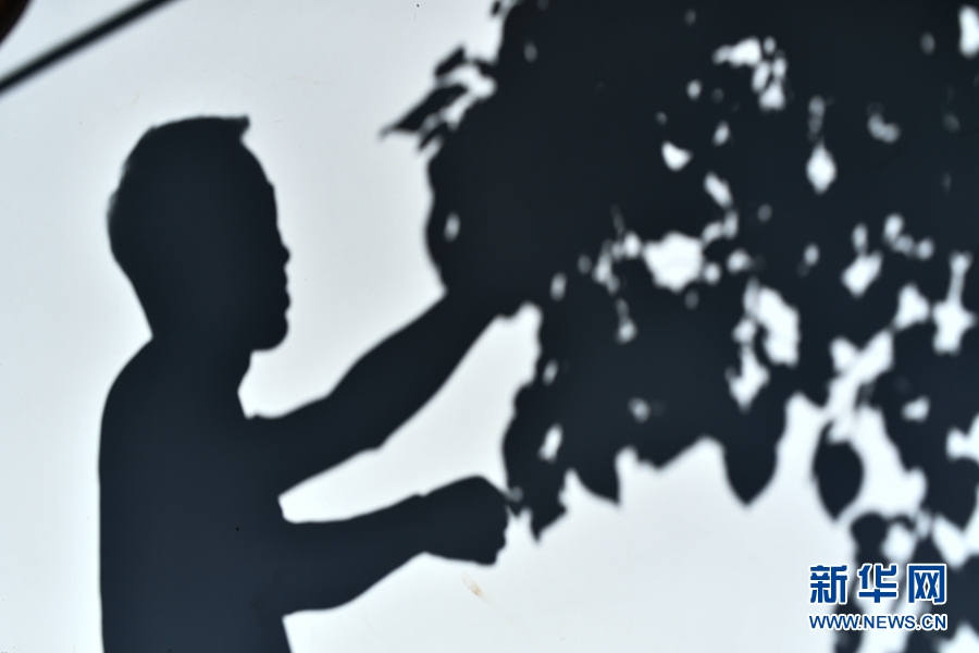 游客在楊林春的農家院里采摘水果時映在墻上的影子。新華網 潘彬彬 攝