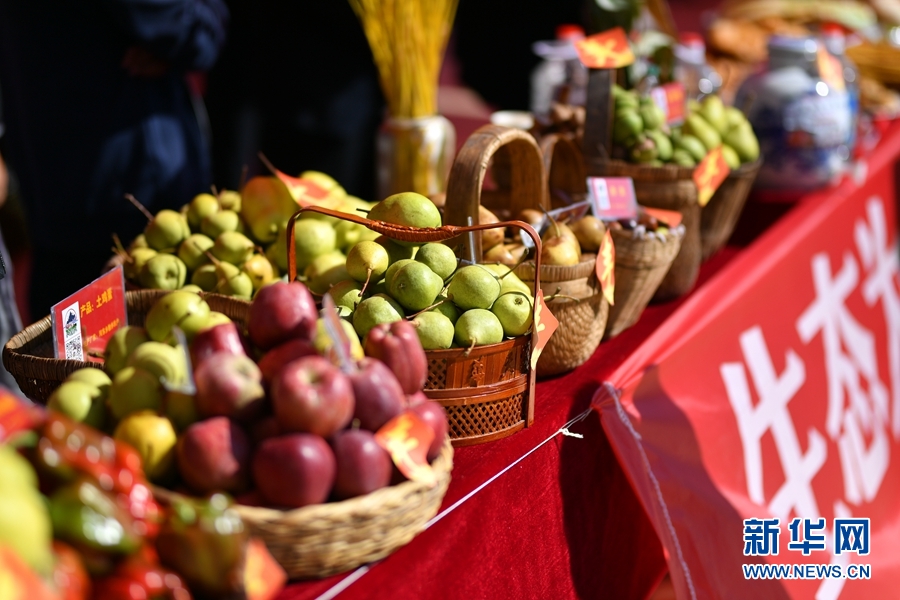 9月23日,貴德縣慶祝第四屆“中國農民豐收節(jié)”活動現場展示的當地水果。新華網 潘彬彬 攝