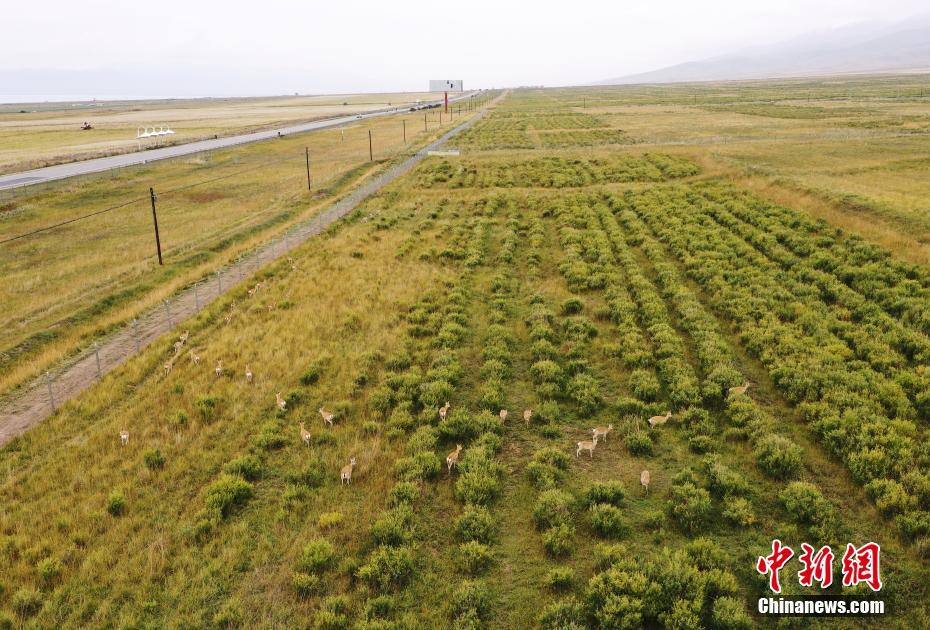 9月27日,在青海省海南藏族自治州共和縣青海湖國家級(jí)自然保護(hù)區(qū)南岸保護(hù)站,普氏原羚在草場內(nèi)進(jìn)食。(無人機(jī)照片) 中新社記者 馬銘言 攝