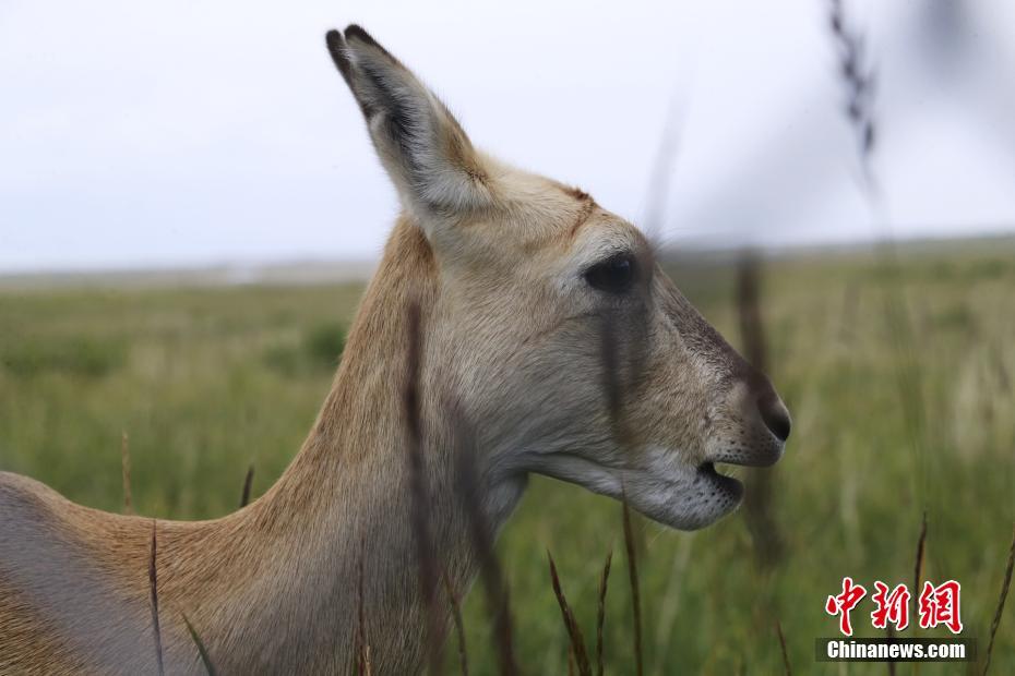 9月27日,在青海省海南藏族自治州共和縣青海湖國家級(jí)自然保護(hù)區(qū)南岸保護(hù)站,普氏原羚在草場內(nèi)進(jìn)食。 中新社記者 馬銘言 攝