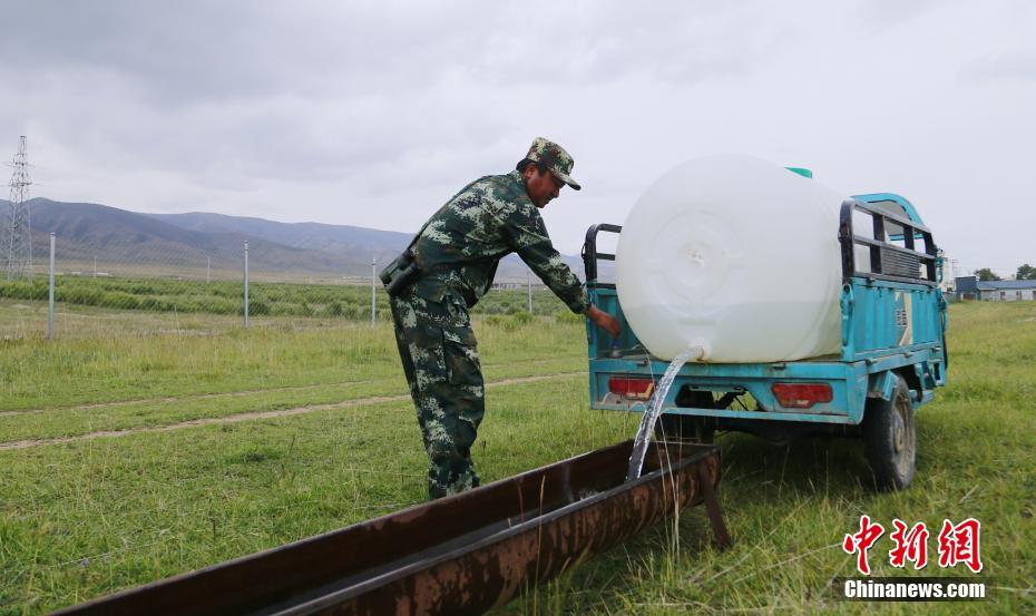 9月27日,在青海省海南藏族自治州共和縣青海湖國家級(jí)自然保護(hù)區(qū)南岸保護(hù)站內(nèi),管護(hù)員往普氏原羚的水槽內(nèi)添水。中新社記者 馬銘言 攝