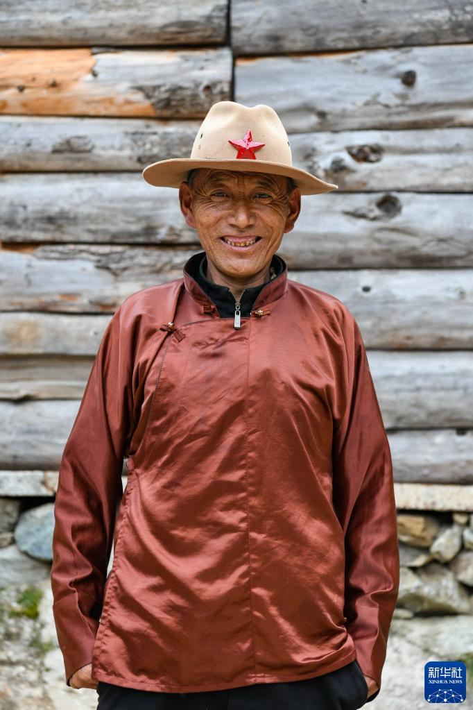 在四川省甘孜藏族自治州白玉縣打乙西村,村黨支部書記白瑪扎西戴著鑲好五角星的帽子留影。新華社記者王曦 攝