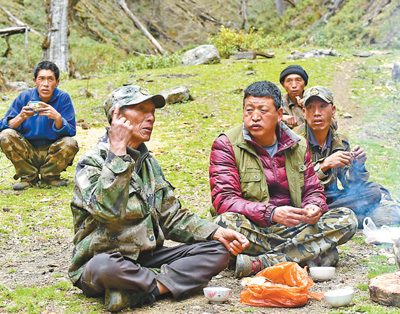 鐘泰(左三)和護(hù)林員們在野外巡護(hù)間隙用餐。于鳳琴 攝(人民視覺)