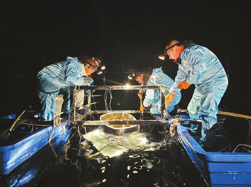 10月16日,科研人員在水切倫科夫探測(cè)器水池中安裝光電倍增管,它們被固定“懸”在水下,接收“散落”水中且產(chǎn)生切倫科夫光的宇宙線。