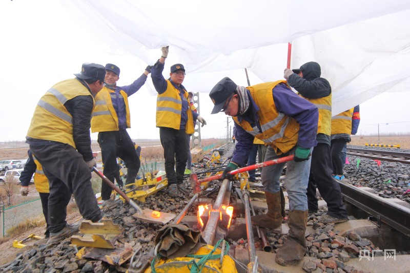 但這還不夠,為了讓鋼軌充分舒放“筋骨”、釋放應(yīng)力,職工們還必須切開鋼軌,緊接著進(jìn)行焊聯(lián),這項(xiàng)工作由德令哈重點(diǎn)維修車間負(fù)責(zé)。車間主任郭鋒亮一邊組織職工開動(dòng)切割機(jī)實(shí)施精準(zhǔn)切割,一邊組織職工架起焊鍋?;鸹w舞,火苗竄升,作業(yè)人員的對比服在火光和風(fēng)雪的映襯下顯得更加熠熠生輝。最終,做完“伸展運(yùn)動(dòng)”的鋼軌在焊劑的作用下重新融合在了一起,經(jīng)打磨后再難區(qū)分彼此。