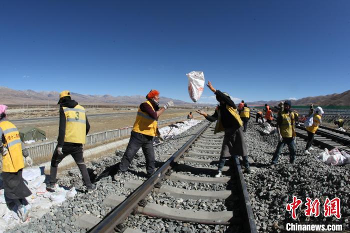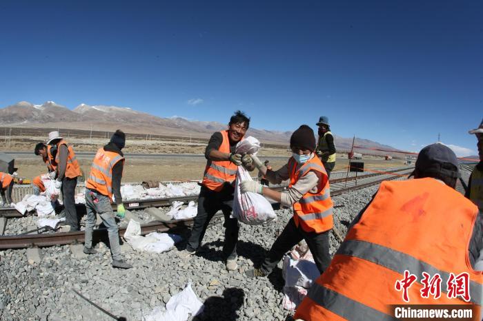 藍天白云,風(fēng)和日麗,念青唐古拉山腳下,一群“天路保健醫(yī)生”身穿工裝、手持器械、翹首以待準(zhǔn)備為道床“洗澡修腳”。