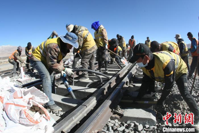圖為工人對達瓊果站2號道岔精細(xì)搗固。中鐵十二局集團鐵路養(yǎng)護公司當(dāng)雄車間供圖