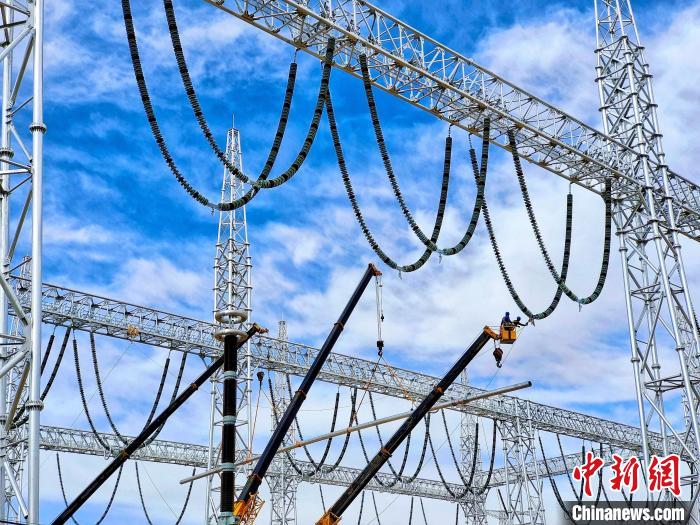 圖為青海送變電工程有限公司施工人員對(duì)超長(zhǎng)大跨距管型母線采用雙機(jī)抬吊安裝。鄒建華 攝
