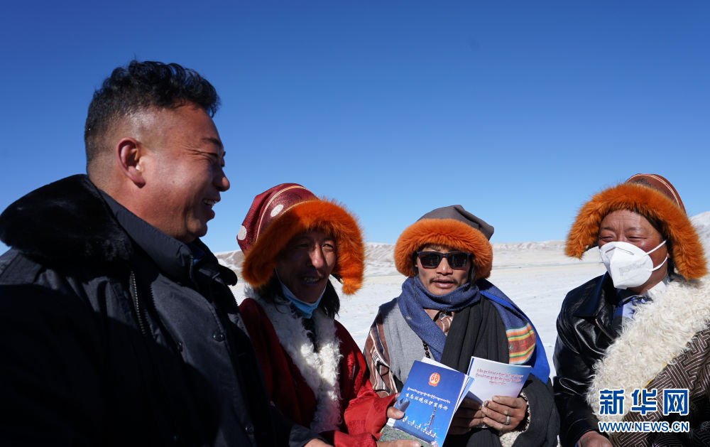 12月20日,青海省果洛藏族自治州瑪多縣人民法院院長(zhǎng)錢快乾(左一)在雪后草原上為當(dāng)?shù)啬羺^(qū)群眾普及法律知識(shí)。新華社記者 李寧 攝