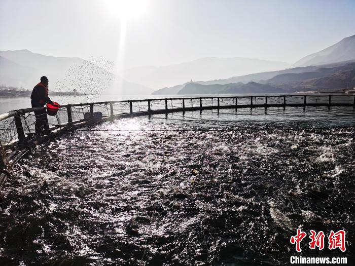 圖為尖扎縣黃河水面養(yǎng)殖網(wǎng)箱里的鮭鱒魚(yú)?!?zhí)砀?攝