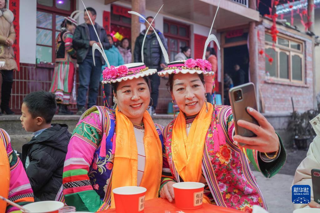 1月13日,在隴南市文縣鐵樓藏族鄉(xiāng)寨科橋村的白馬藏族婚禮上,賓客在宴席上拍照留念。新華社記者 郎兵兵 攝