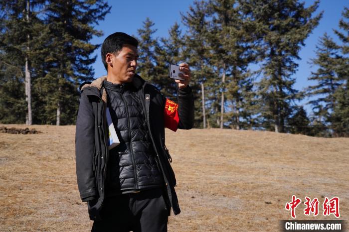 圖為桑杰加用手機(jī)記錄自己巡護(hù)的林場?!●R銘言 攝