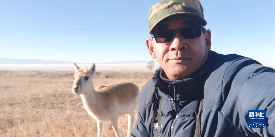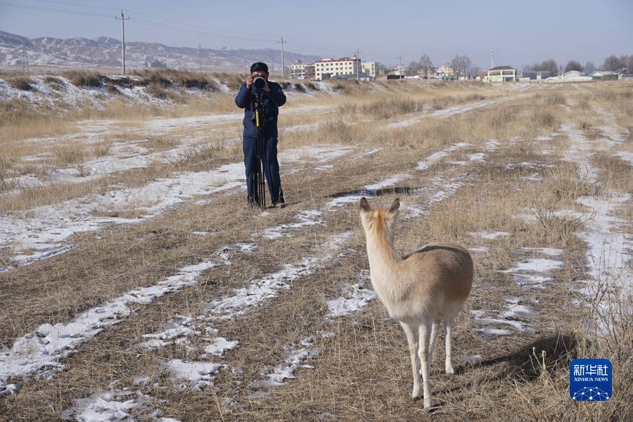 2月11日,吳永林正在和普氏原羚“東東”一起巡查。新華社記者 周盛盛 攝