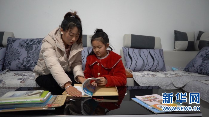 21日晚,尚欣怡和媽媽薛淑琴在新家一起包書(shū)皮。新華社記者 郎兵兵 攝