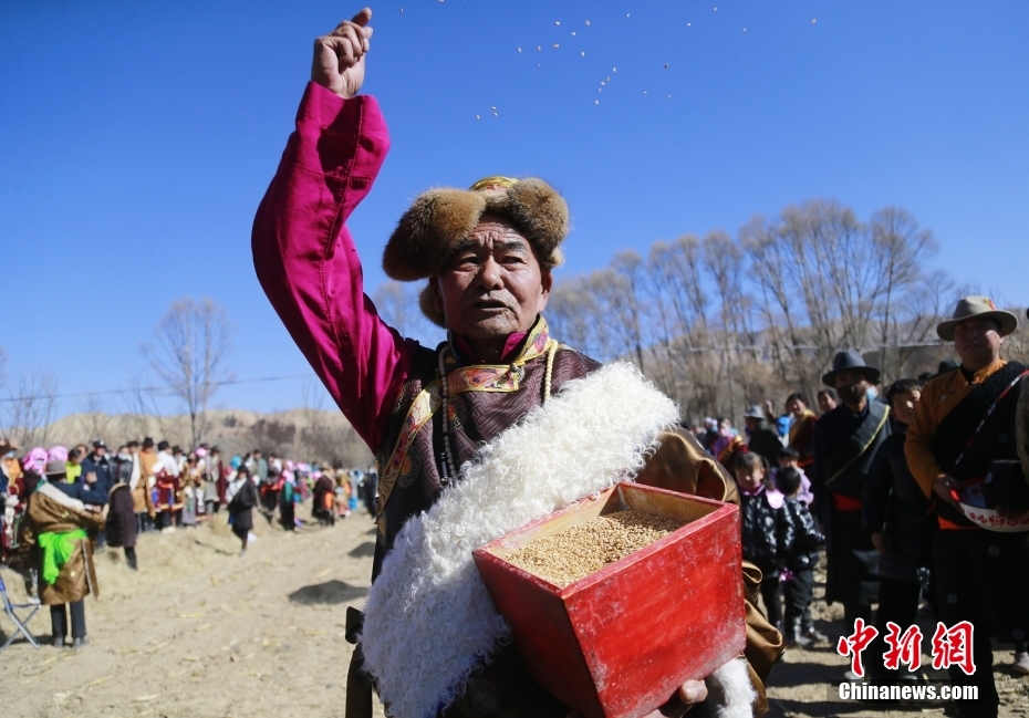 2月24日,一位藏族村民撒種祈福。中新社記者 馬銘言 攝