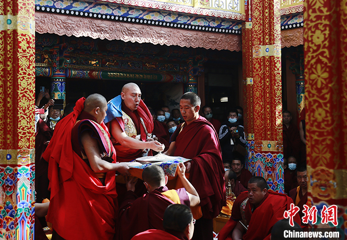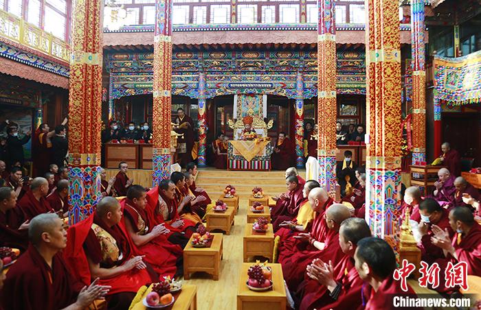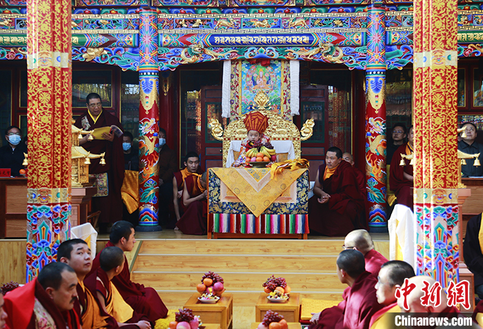 2月25日,農(nóng)歷正月二十五,青海省西寧市湟中區(qū)塔爾寺舉行第九世格嘉·久美慈成南杰活佛坐床繼位典禮。中新社記者 馬銘言 攝