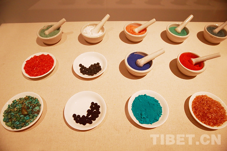 唐卡在顏料原料的選擇上,以礦物和植物為主,比如:金、銀、瑪瑙、孔雀石、青金石、朱砂等,以及藏紅花、大黃、藍靛等。天然的原料加之獨特的研制工藝,所繪制出的唐卡歷經(jīng)數(shù)百年,依然可以保持色澤艷麗。圖為唐卡顏料的原料 攝影:許娜