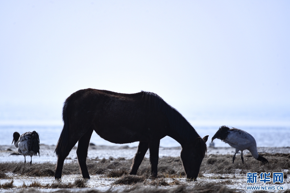 兩只黑頸鶴與一匹駿馬在青海湖畔覓食。新華網(wǎng) 潘彬彬 攝