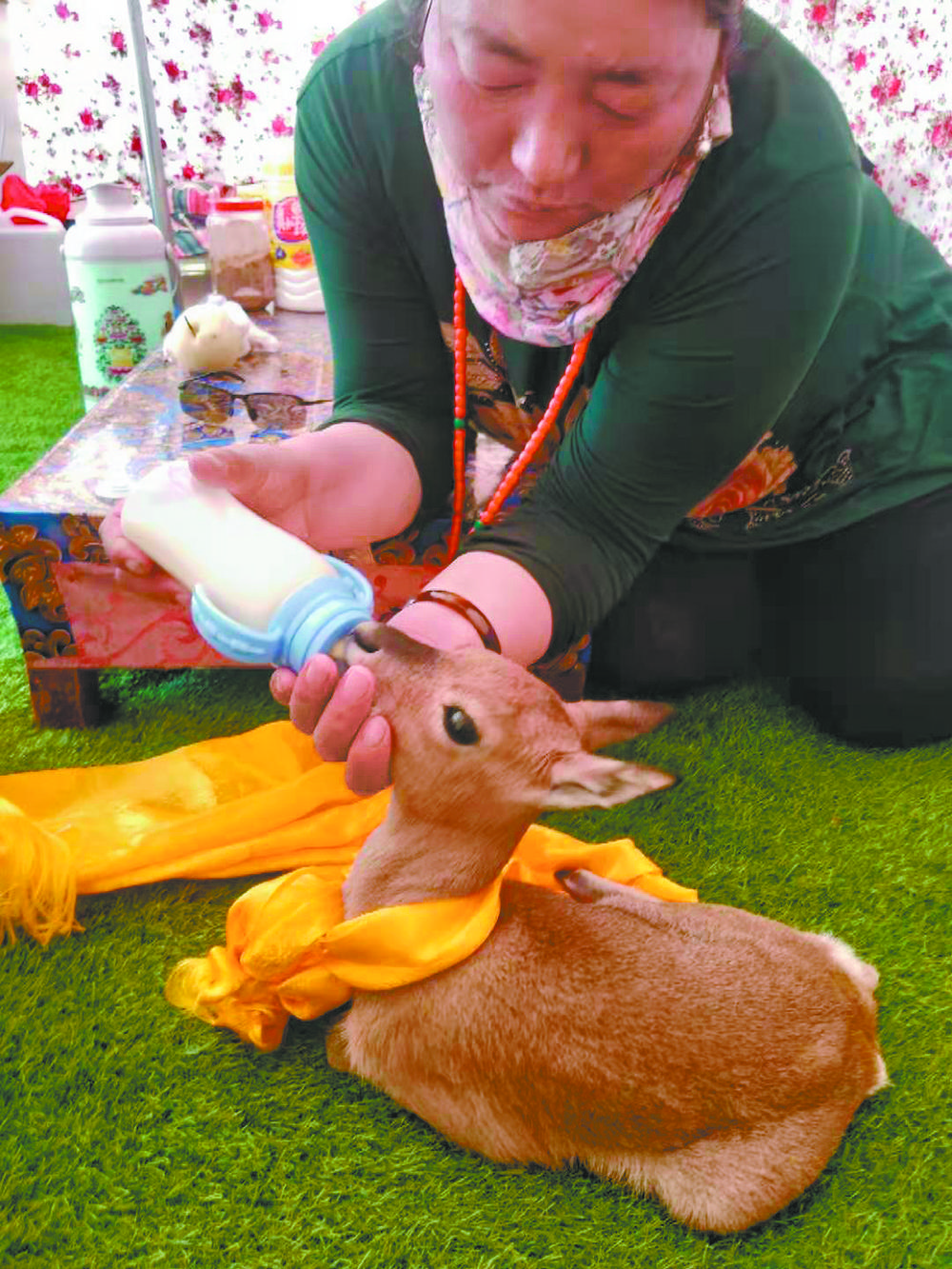 妻子扎西卓瑪始終沒有放棄喂養(yǎng)它,最初的3天,她每天都要花6個多小時,或跪著或趴著,把奶嘴一次次伸進“豆豆”口中,但又一次次被吐了出來。一家人整夜操心,輪流給它喂水喂奶,扎西卓瑪還在它的脖子上系了一條黃色的哈達,當(dāng)做“幸運結(jié)”,希望小原羚能活下來。