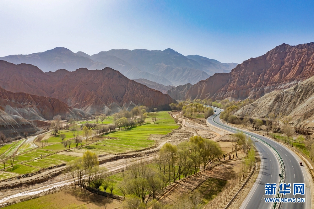 公路蜿蜒在丹霞峽谷中,四周山脈層層疊起,工整而靈動(dòng),風(fēng)景絕美。新華網(wǎng) 宋忠勇 攝