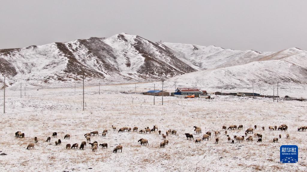 3月31日,青海省黃南藏族自治州河南蒙古族自治縣,一群歐拉羊在雪后的草原上吃草(無人機照片)?!⌒氯A社記者 王艷 攝