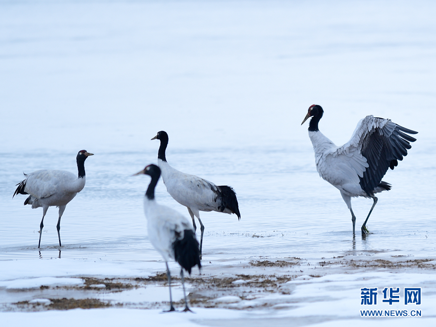 在位于青海省果洛藏族自治州瑪多縣的三江源國家公園黃河源園區(qū)內,數(shù)只黑頸鶴在此棲息覓食。新華社記者 張龍 攝