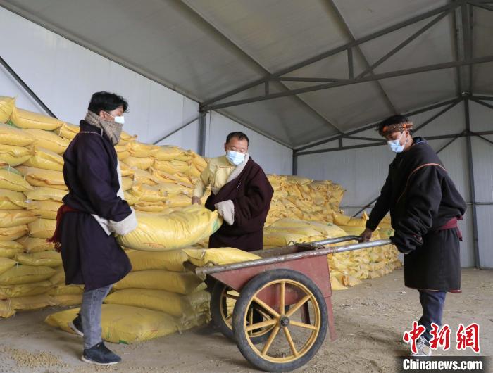 圖為工作人員轉(zhuǎn)運飼料。張海麟 攝