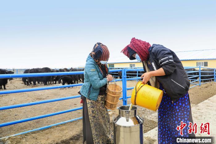 在畜棚外的柵欄里,母牛慵懶地反芻并守護著蹄下初生的牛犢,絲毫不因人員走動而感到驚慌。從牧民變身飼養(yǎng)員的婦女們進進出出,忙碌著為欄里的牦牛添加飼料。