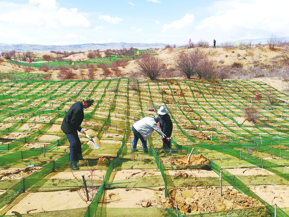 陶銳說:“比如在流動半流動沙丘,我們將工程固沙與生物治沙相結合。在迎風面設置1.5m×1.5m的草方格沙障,在設置好的草方格沙障內栽植青楊,進行烏柳插桿并點播檸條沙蒿等,而在背風坡實行插桿造林。在丘間地,我們則采取植苗造林,栽植烏柳苗和沙棘苗,并用網圍欄進行封育等?!?/p>