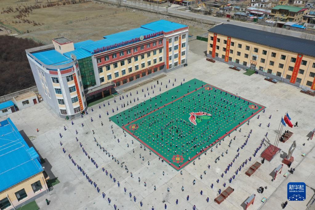 4月18日,稱多縣文樂中心寄校的學(xué)生們跳操(無人機照片)。新華社記者 韓方方 攝