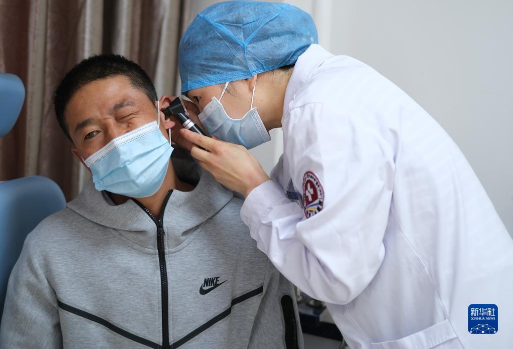 4月25日,青海省婦女兒童醫(yī)院醫(yī)生、青南支醫(yī)隊員孫敬在青海省玉樹藏族自治州人民醫(yī)院給患者檢查身體。新華社記者 韓方方 攝