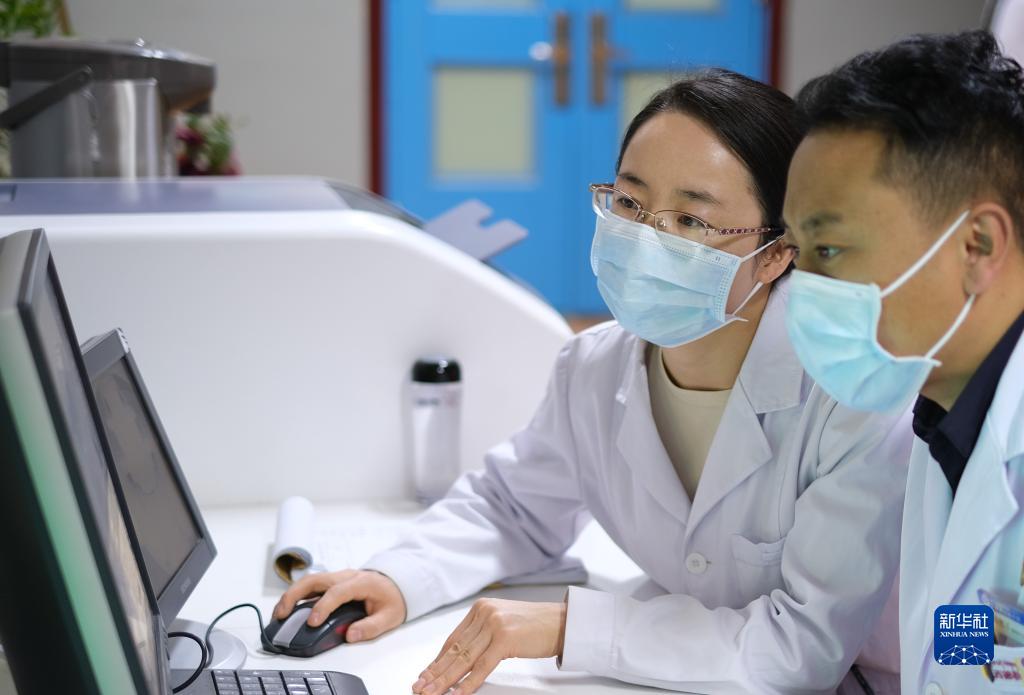 4月25日,青海省婦女兒童醫(yī)院醫(yī)生、青南支醫(yī)隊員孫敬(左)給青海省玉樹藏族自治州人民醫(yī)院醫(yī)生講解患者胸部CT。新華社記者 央秀達珍 攝